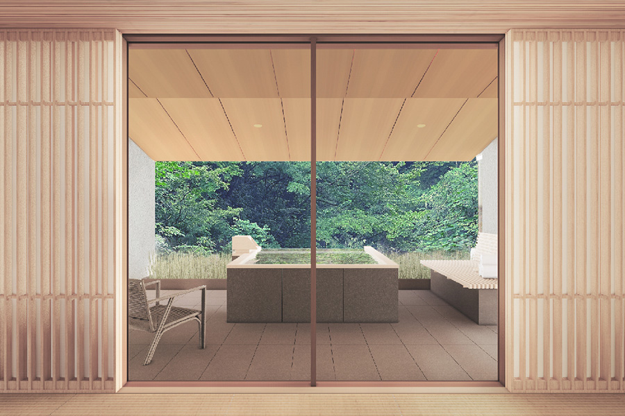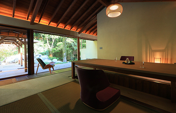 広々としたワンルームから、奥湯河原の自然に手が届きそうな専用庭園までは一つの空間。