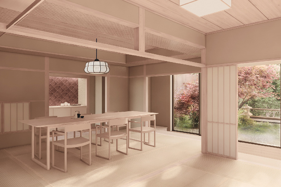 庭園に並ぶ4つの和邸宅は、一棟貸しのプレミアム離れ、紫葉(しよう)。