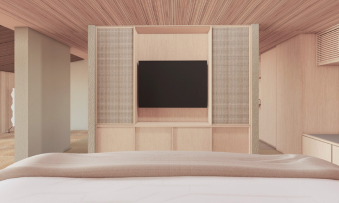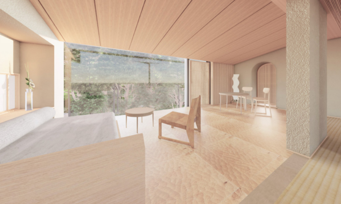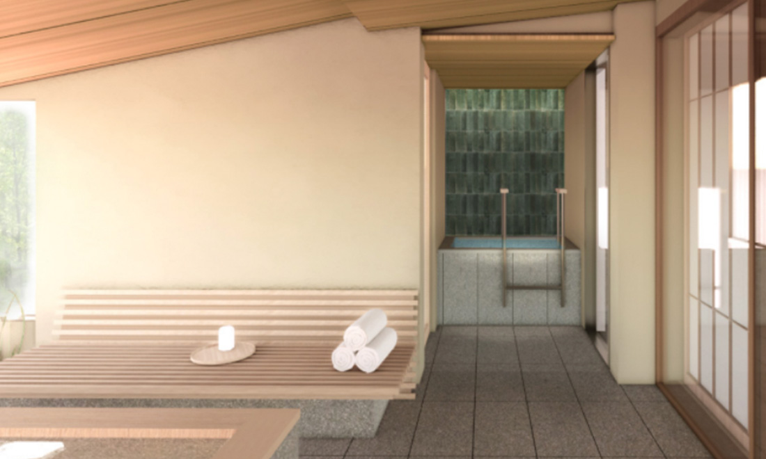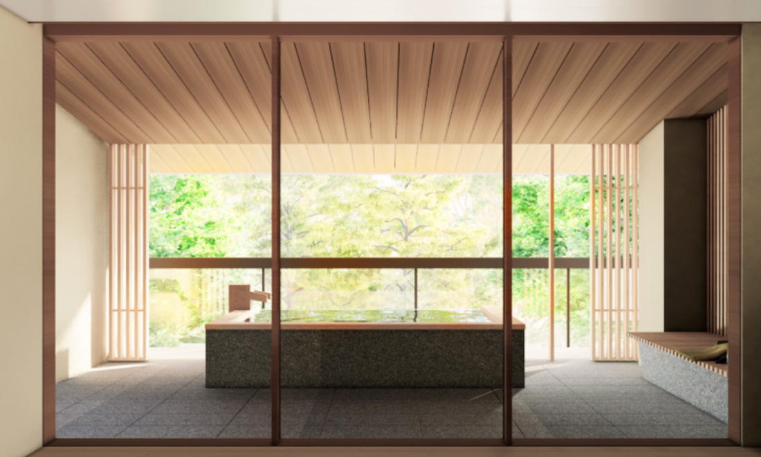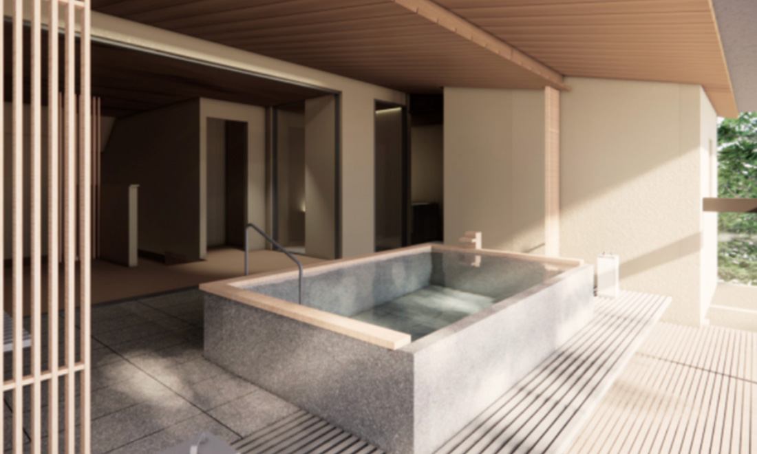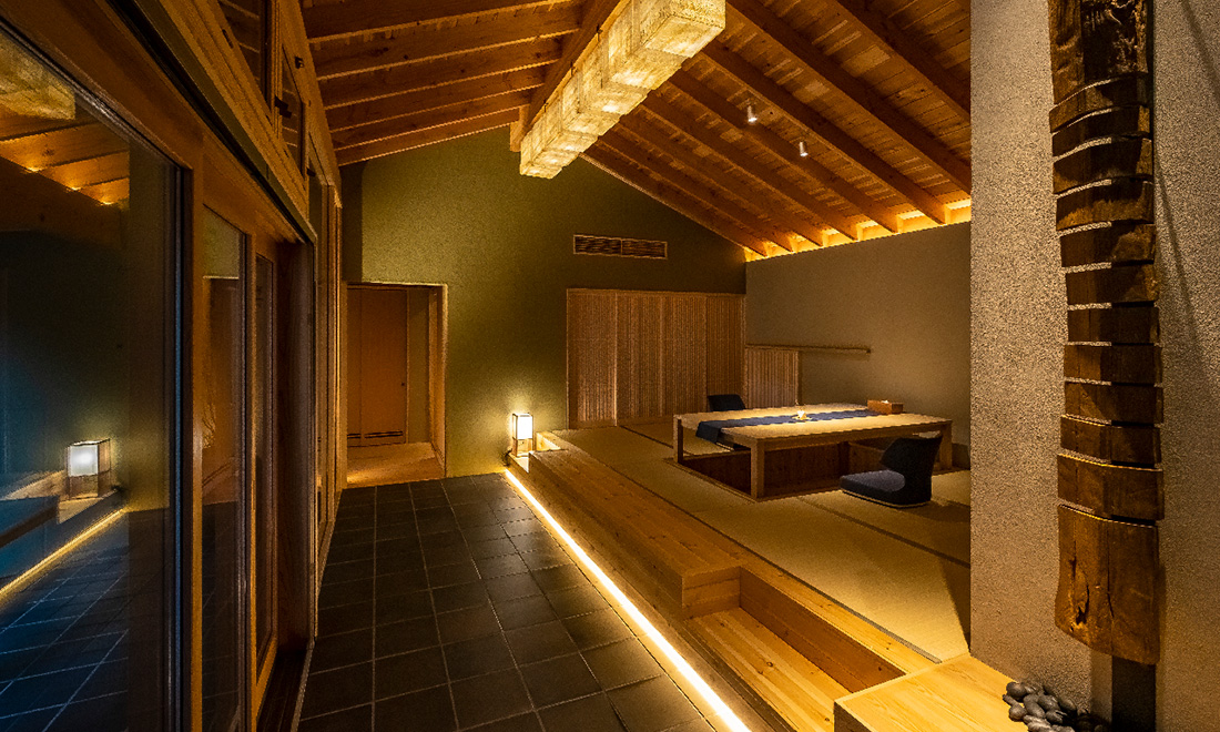 客室はリビング、寝室、天然温泉を備え、100〜150平米の贅沢な和モダン空間です。