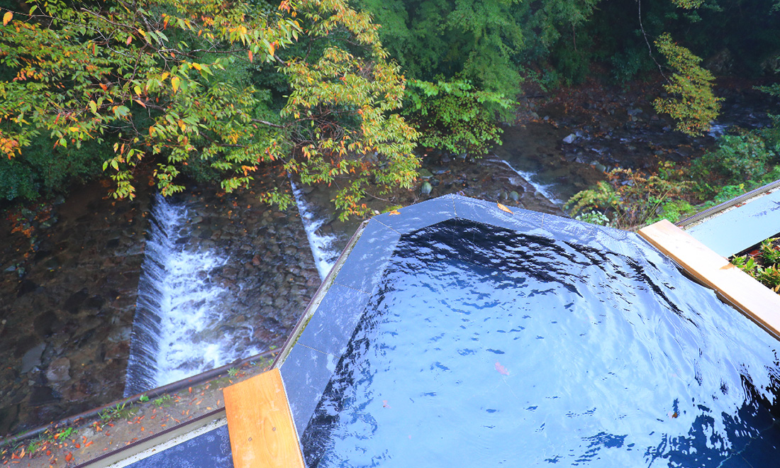 庭の露天温泉では星空を眺め、川のせせらぎの音とともに、癒しのくつろぎ時間が流れます。