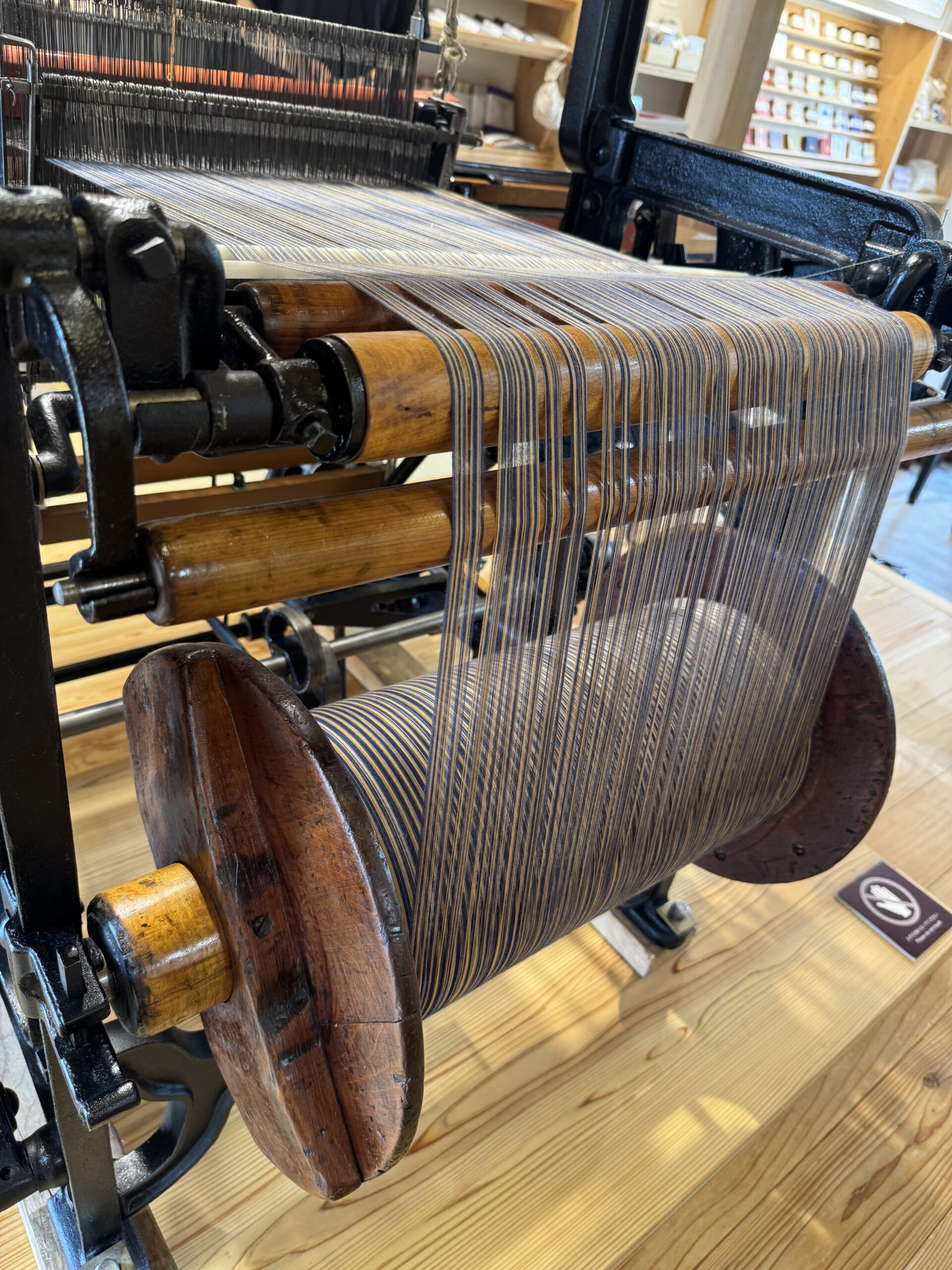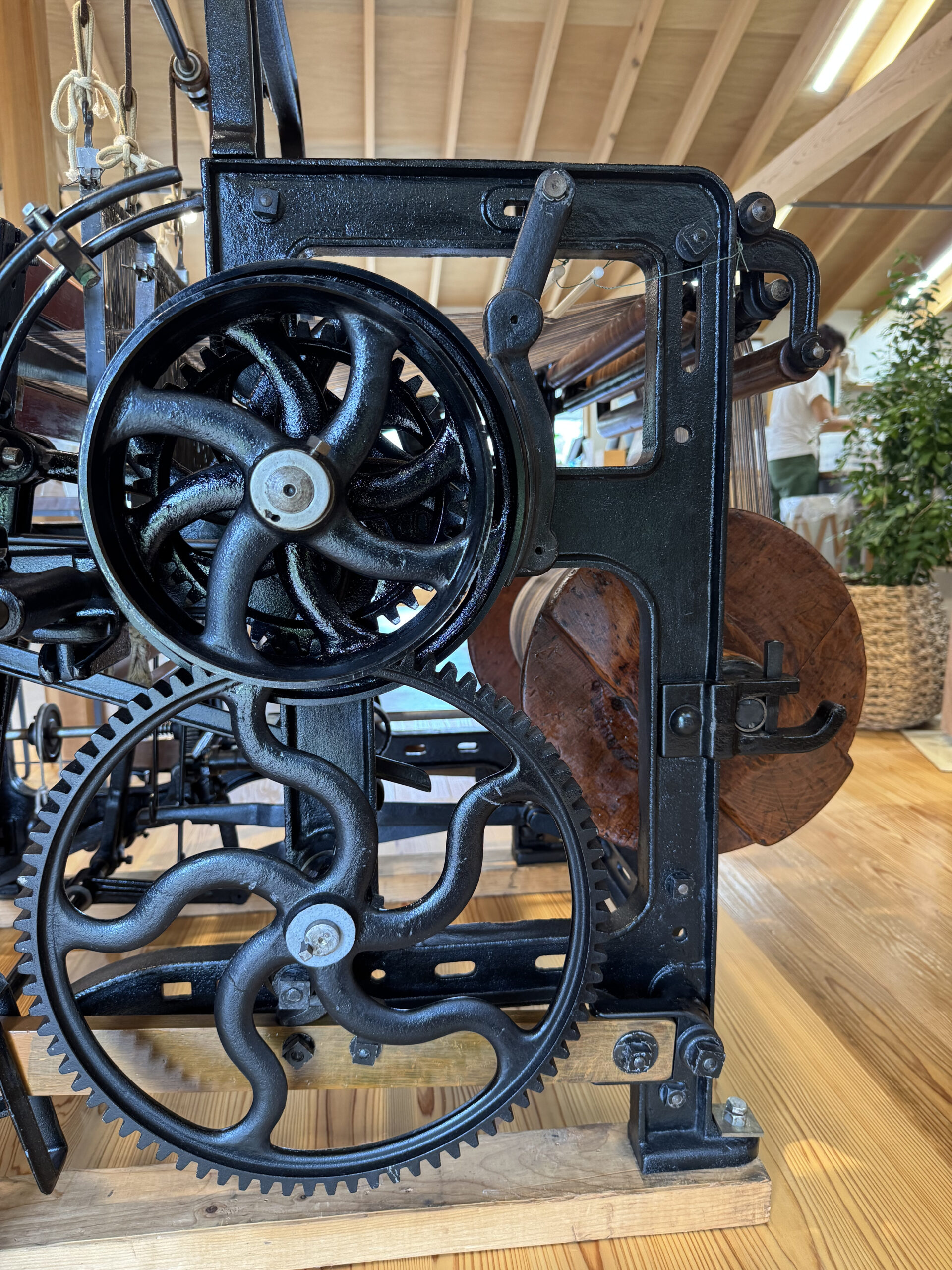工房には昔の織機が展示されております。