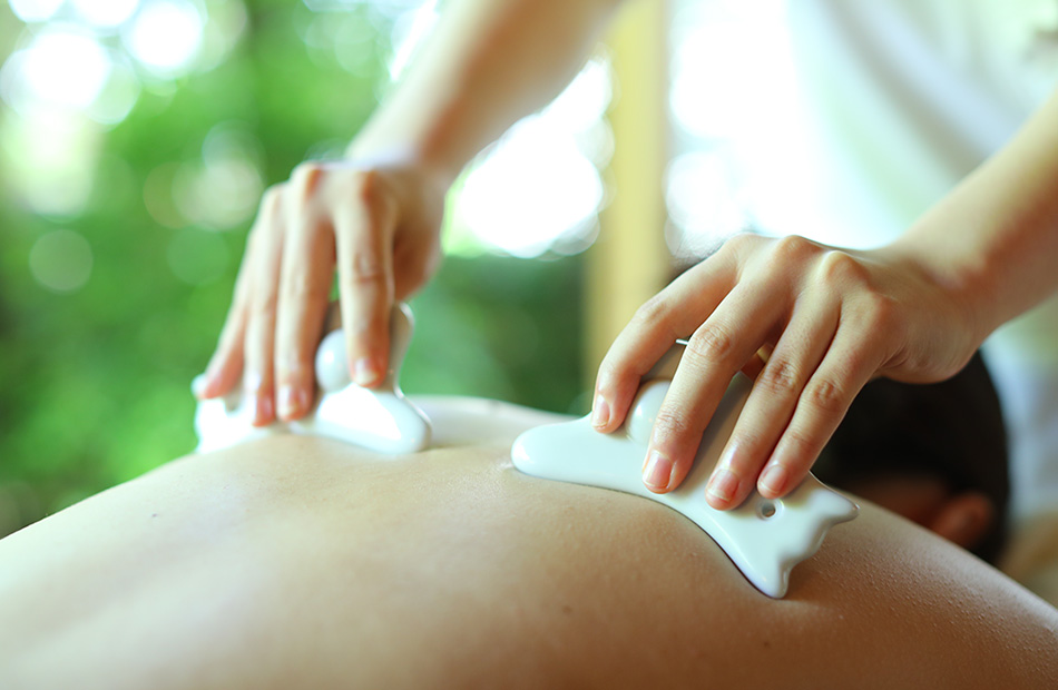 カッサを使用したトリートメントコース。セラピストのハンドテクニックでツボ経路を刺激し、