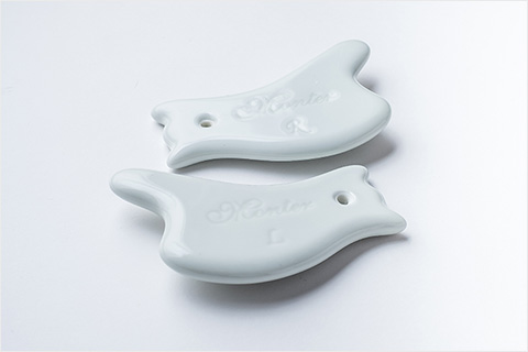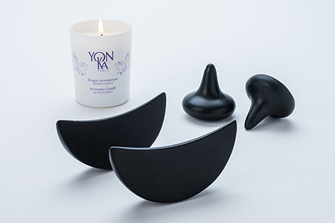 三日月形の形状のクレセントストーンは足、ふくらはぎ、太もものマッサージに、マッシュルームストーンはポイントケア用で全身マッサージの最後に、コリの気になる部分をピンポイントで押してほぐします。