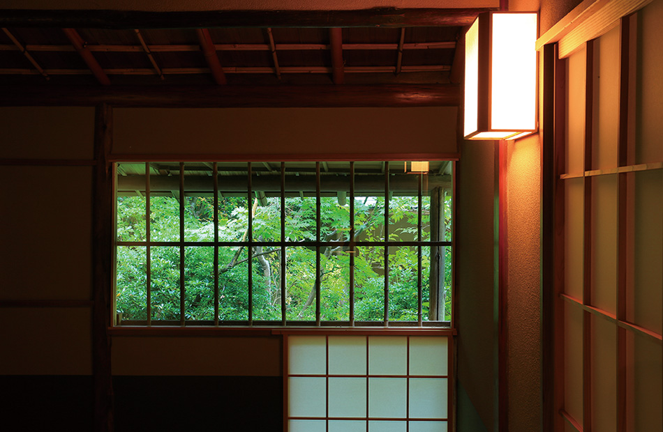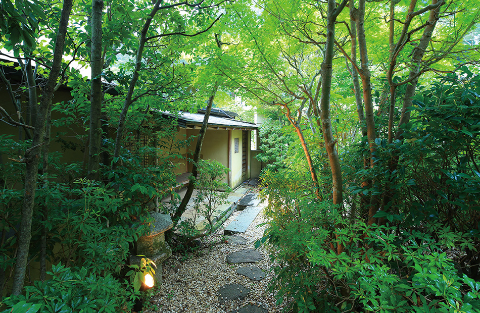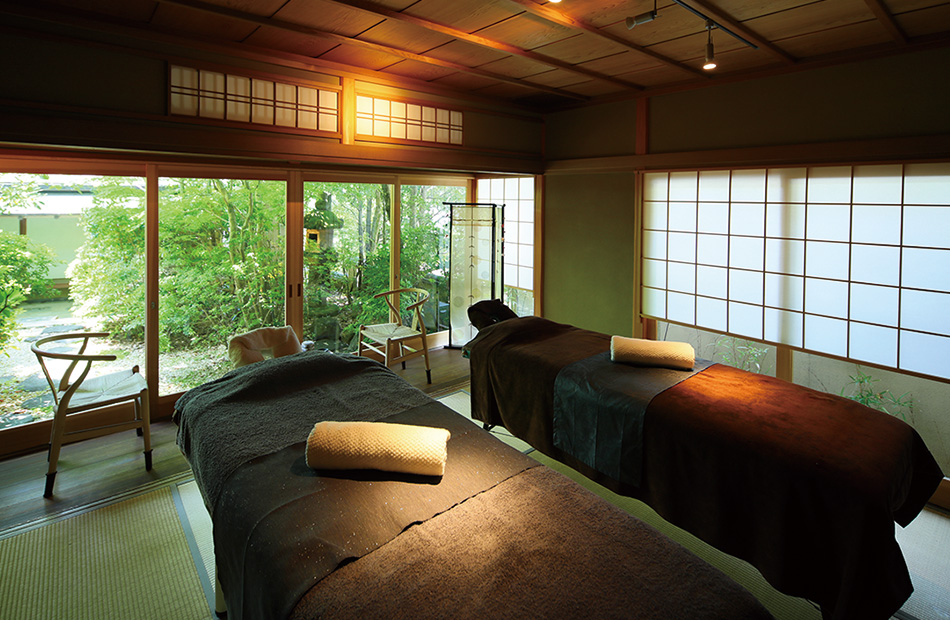 結唯の中庭にひっそりと佇む茶室「心妙庵」。落ち着いた和の空間は、都会の喧騒とは無縁の静けさ。心と体の奥深くがほろりほろりと解放され、やがて穏やかな眠りへと誘われます。